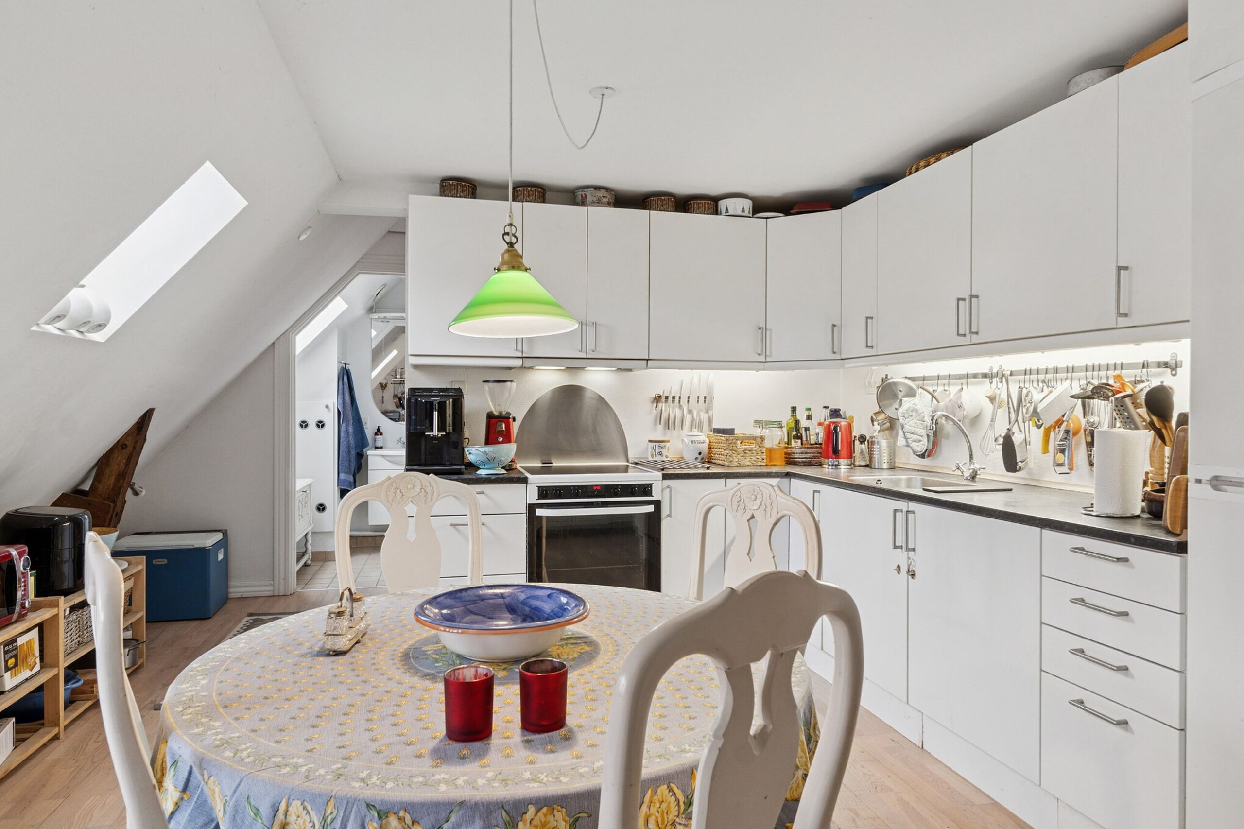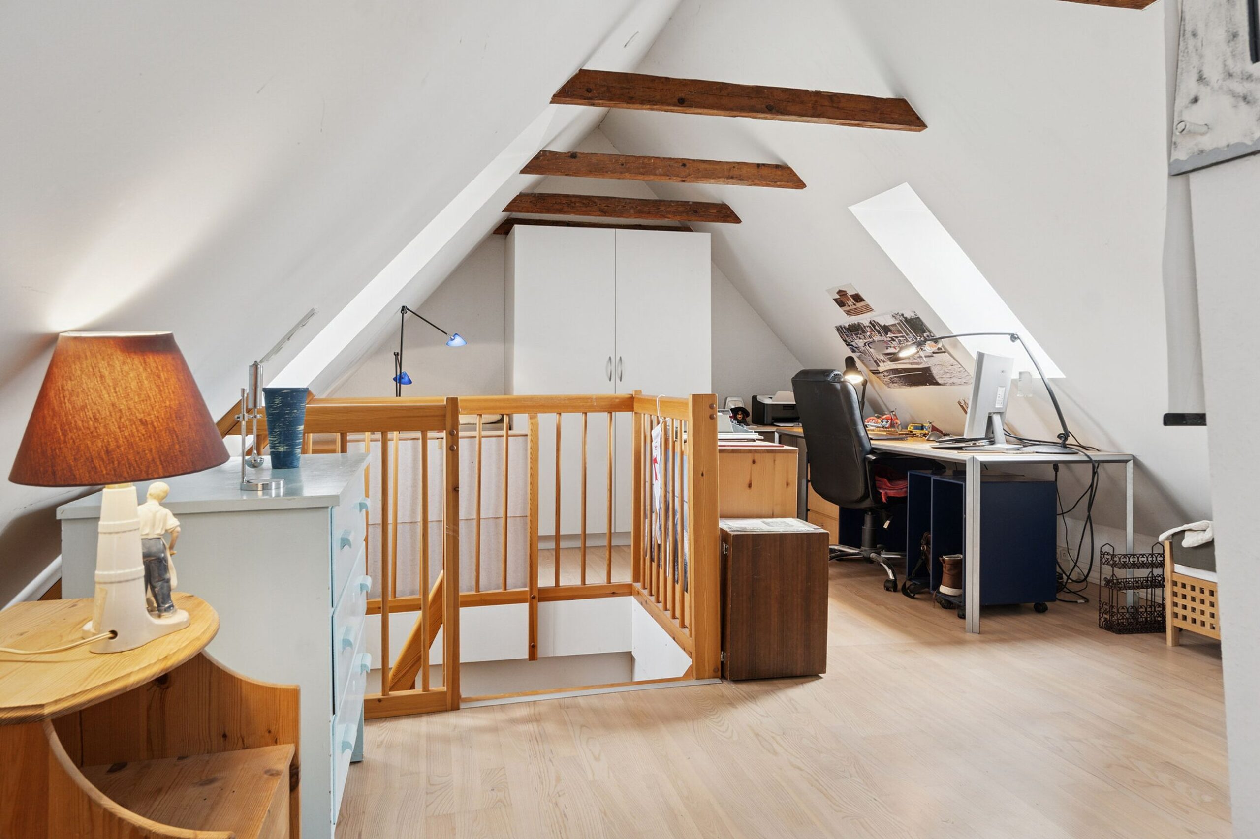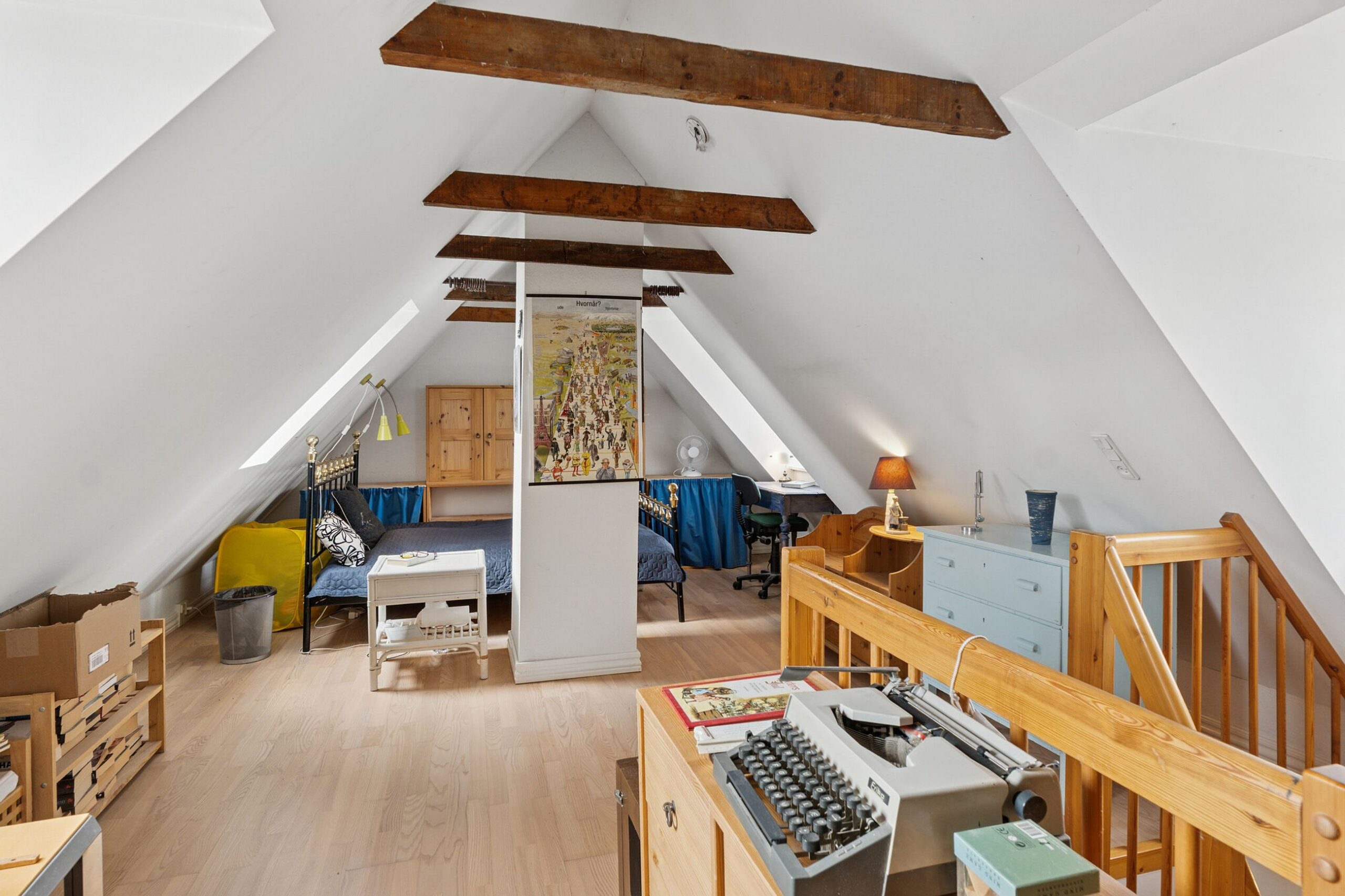 Fra køkkenet er der også trappe til 1.salen, som er indrettet til eet stort kombineret soveværelse og kontor.