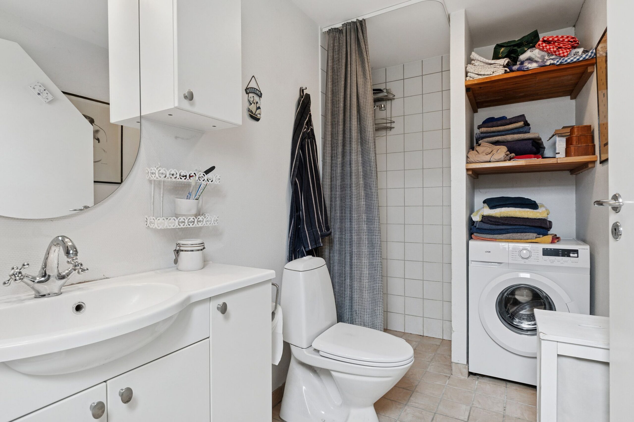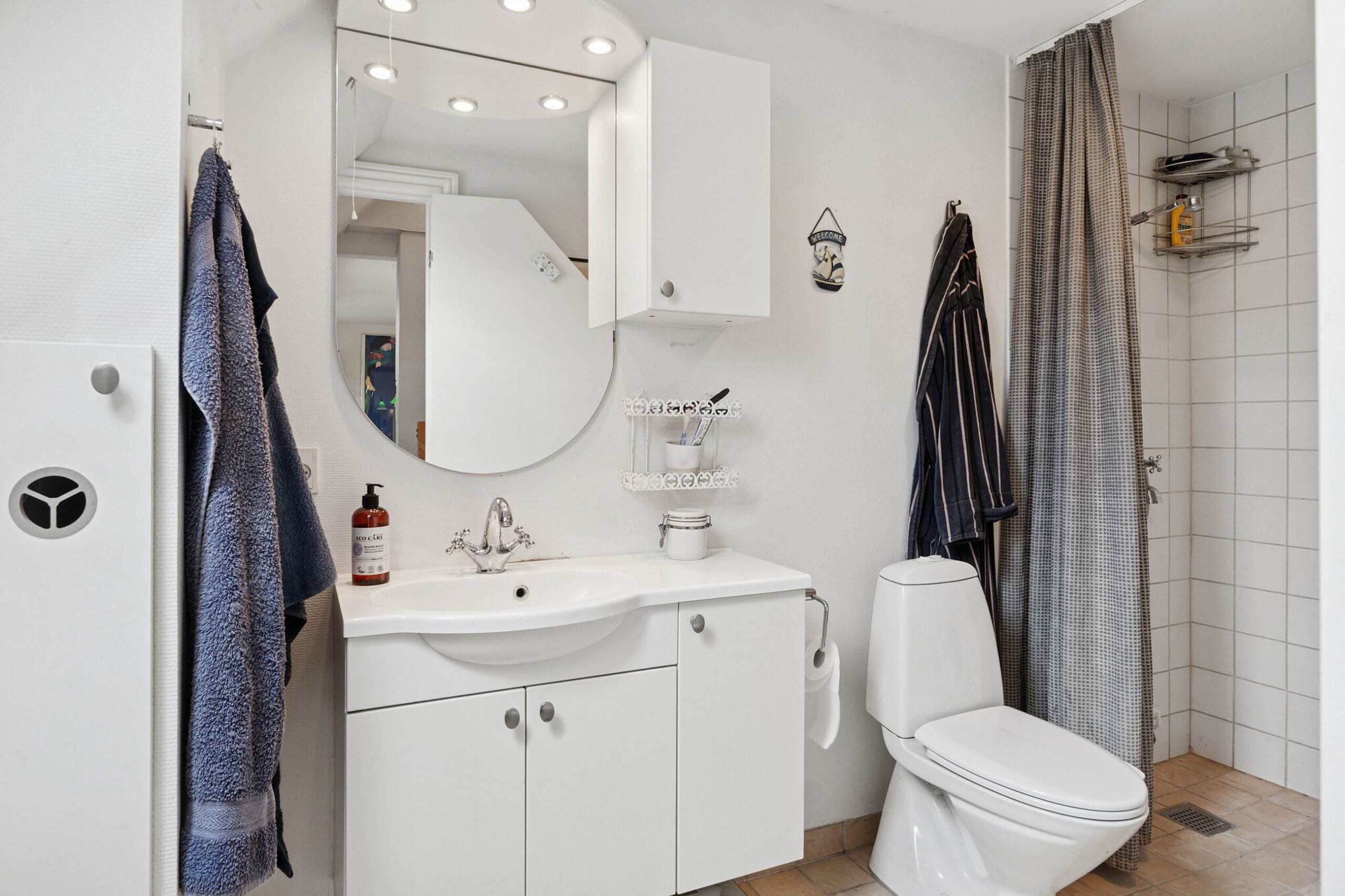 Her er godt og funktionelt køkken med spiseplads, stor opholds-/og spisestue samt brusebadeværelse med plads til vaskemaskine.
