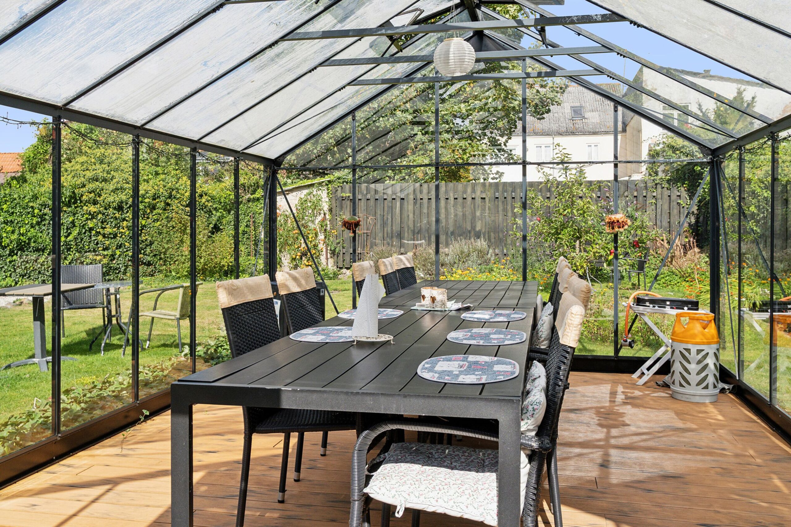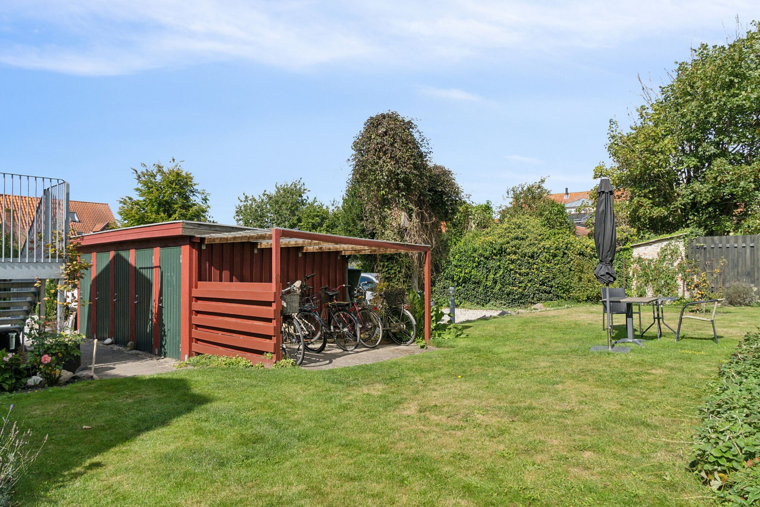 Til lejligheden hører både et privat skur til opbevaring og særskilt kælderplads, som giver praktiske muligheder for opmagasinering. Derudover er der en egen parkeringsplads, som ligger beskyttet, hvilket er en sjælden fordel i bymidten. Ejendommen har et velfungerende fællesskab, hvor beboerne deler en dejlig fælleshave. Her finder man et stort orangeri, der anvendes til alt fra generalforsamlinger til fester, og som også kan bookes individuelt til private arrangementer.