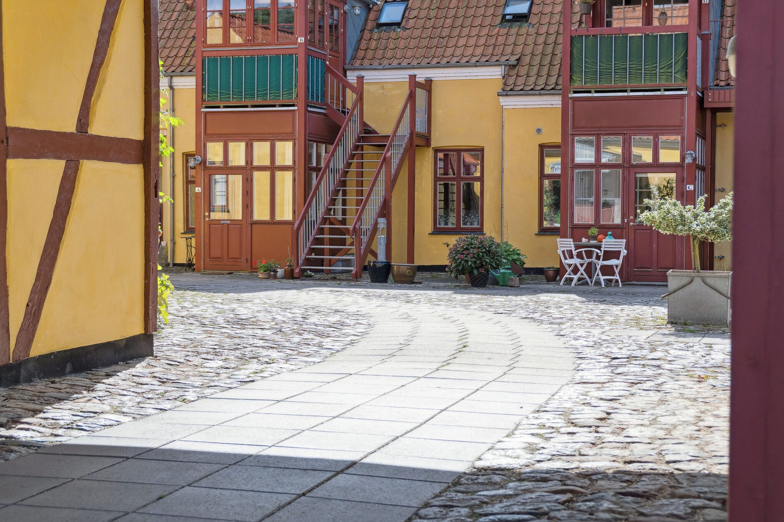 Trappen leder en op til lejligheden og den lukkede terrasse med udsigt til gården og de øvrige bygninger, byder velkommen og fører en ind til den øvrige del af lejligheden.