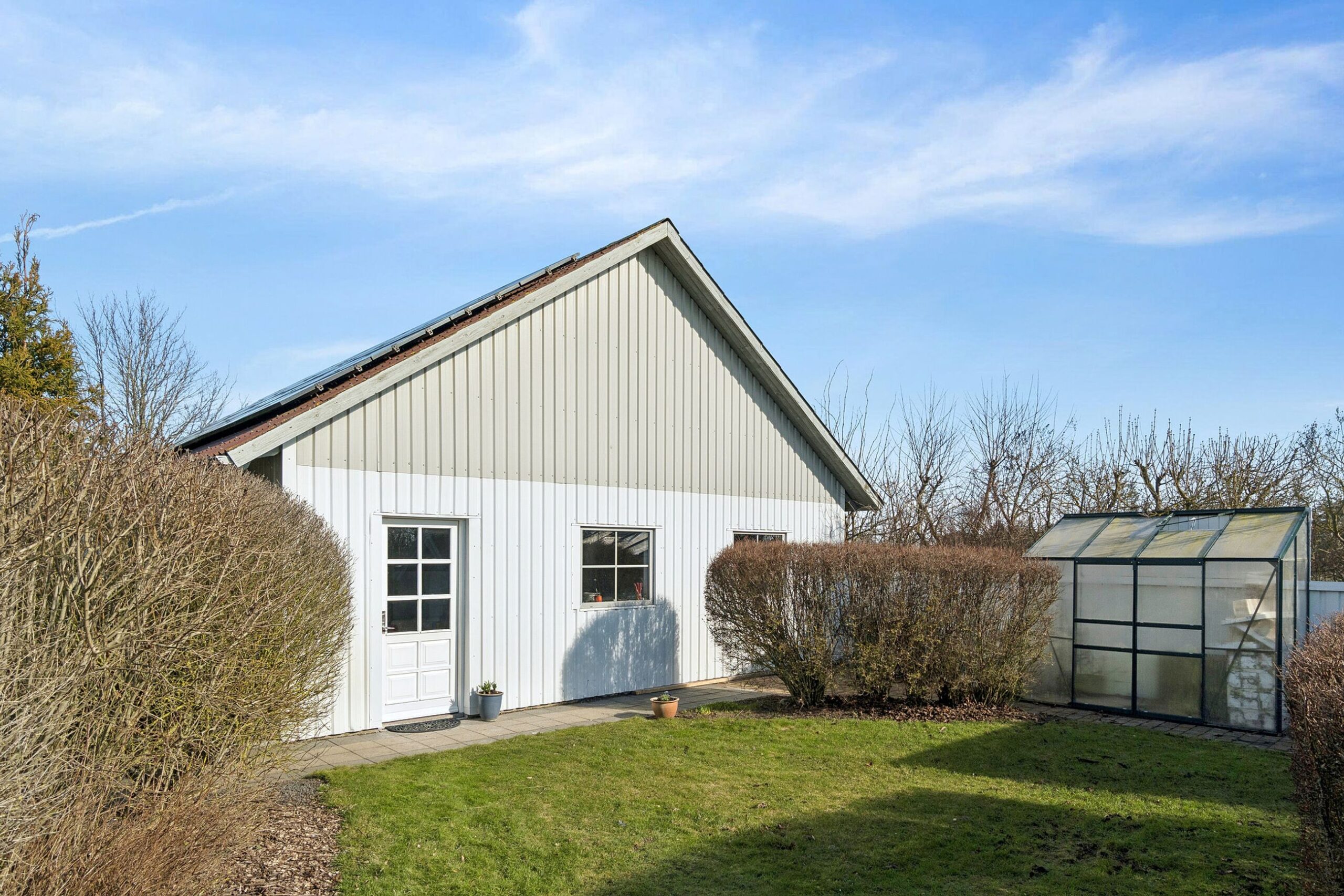 Bygningssættet – hvis man må bruge det udtryk – består dels af selve stuehuset, der er sammenbygget med en større længe og dobbelt carport samt fritliggende stort værksted/maskinhus, med stor port og om ønsket er at “skrue på biler” – indrette til hestebokse eller egentlig bare have godt plads til alle ens hobbyer – ja så kan vi opfylde behovet her.