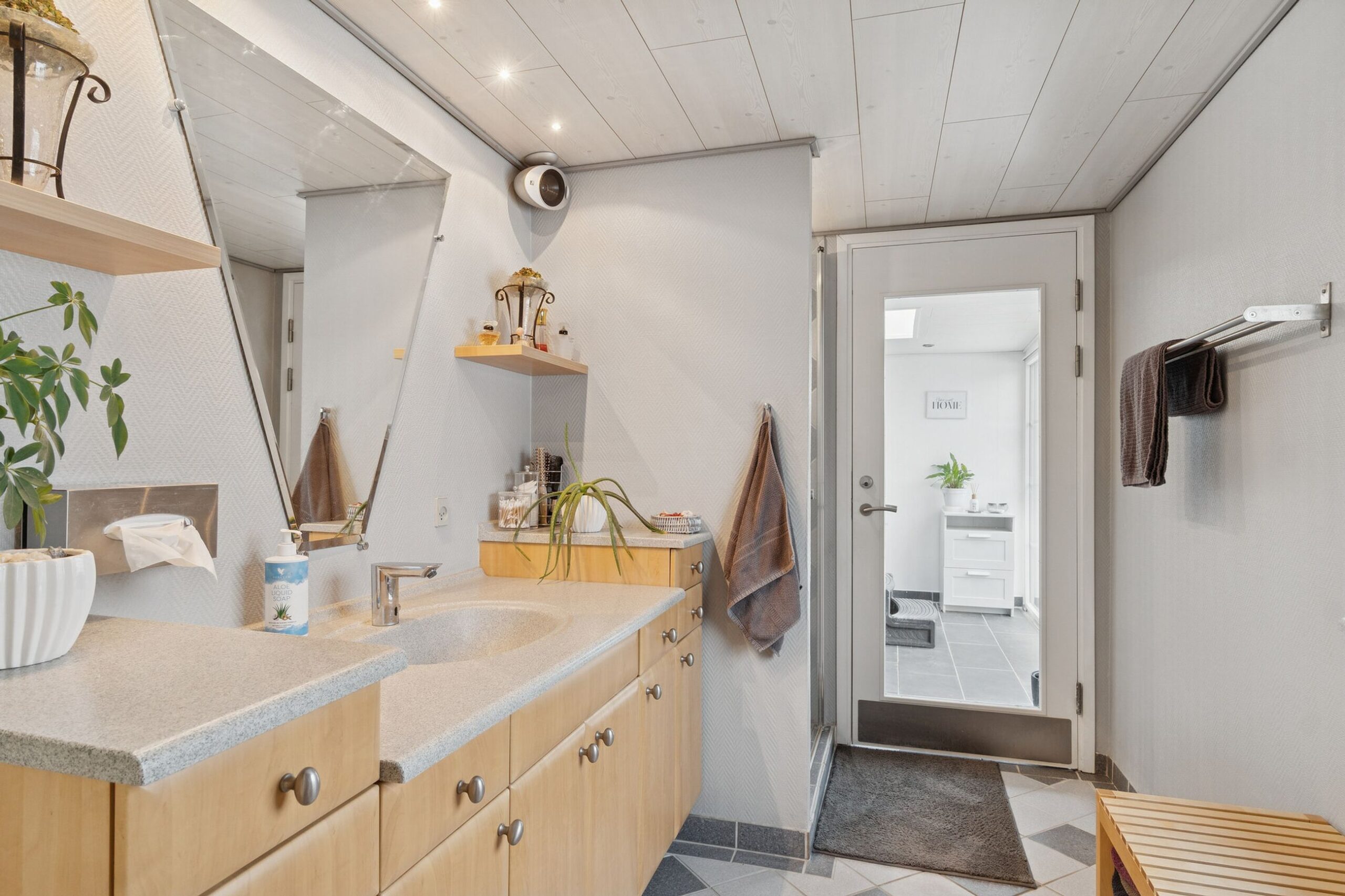 Her er baggang/bryggers, brusebadeværelse med adgang til wellness afsnit med stort spabad, hvor udsigten over Østersøen kan nydes samt stort åbent og kombineret køkken/stue – med seperat spiseafdeling.