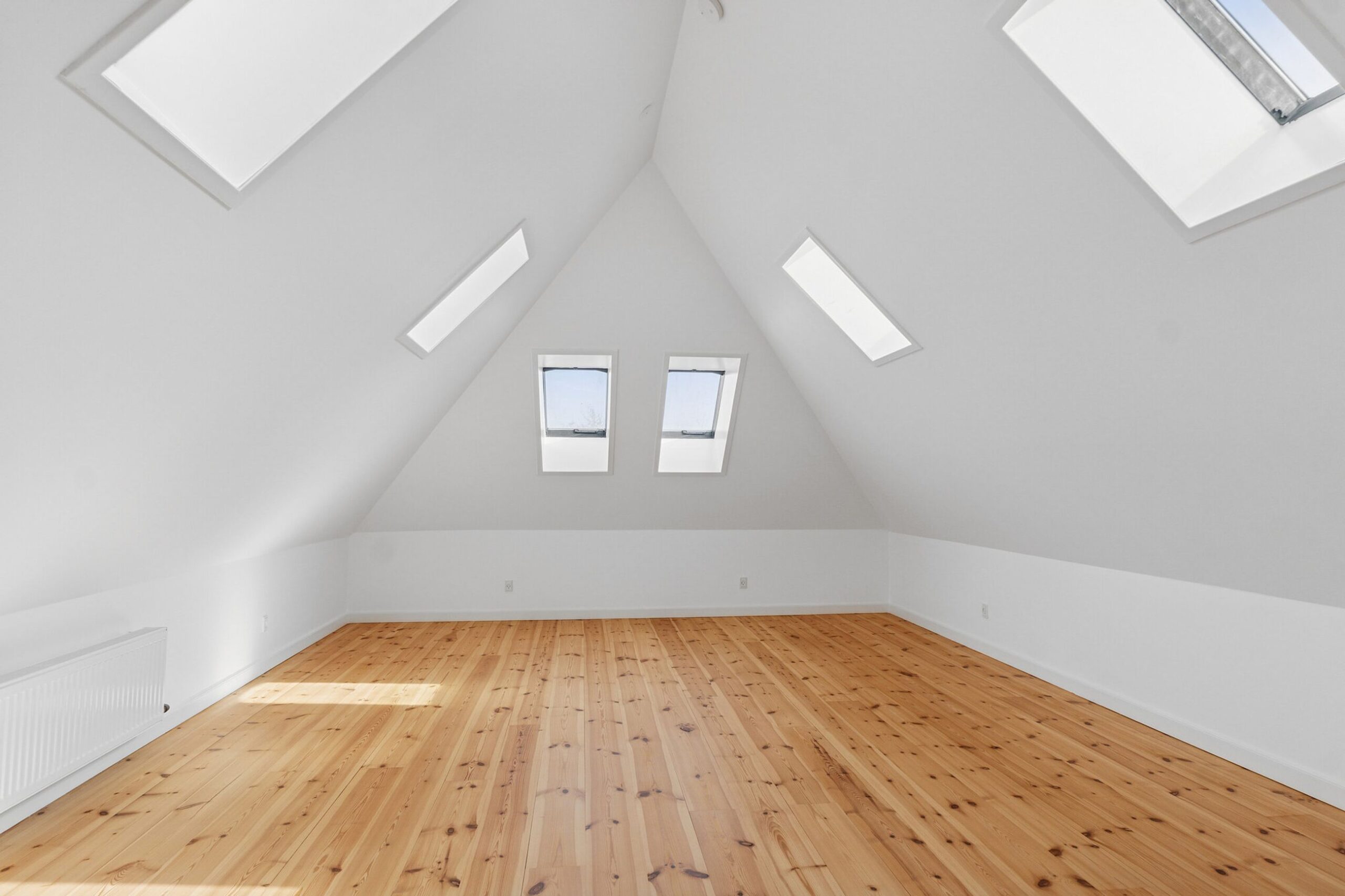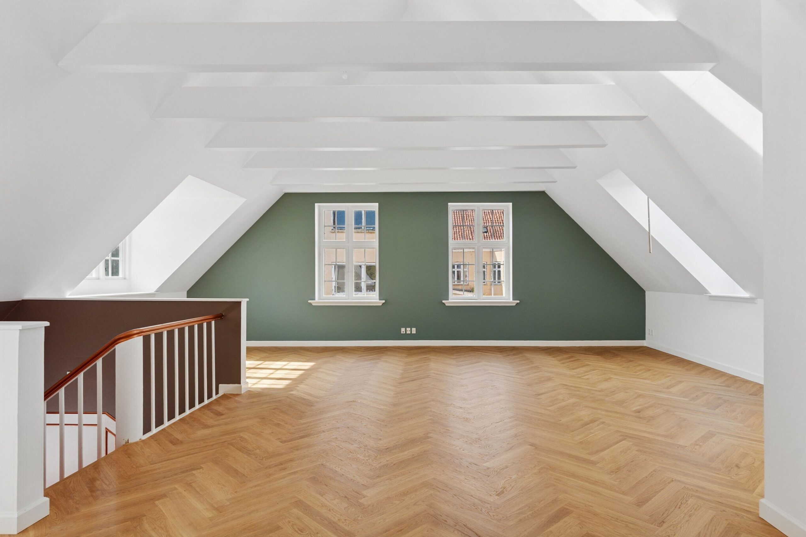Ejendommen gemmer bl.a. på et samtalekøkken, hvor æstetisk fletparket binder rummet sammen med tre meget, meget flotte stuer, og videre finder du to store badeværelser, endnu et opholdsrum på førstesalen og i alt fire dejlige værelser. Endelig har man udnyttet loftsetagen, så du får glæde af endnu et stort, lyst rum, mens kælderetagen ligeledes byder på god “ekstraplads” til det, der giver dig værdi – måske er det en vinkælder, et værksted, et fitnessrum eller noget ganske fjerde.
